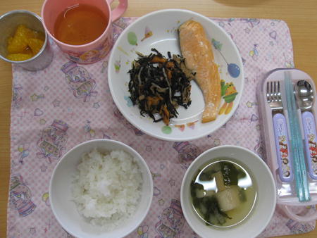 ・鮭塩焼き ・ひじき煮 ・ごはん ・味噌汁 ・みかん缶