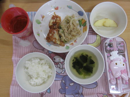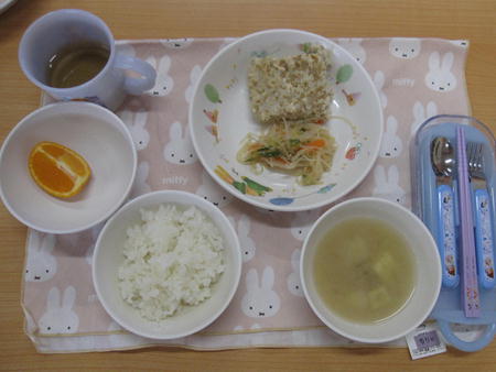 ・鶏のから揚げ ・ひじきサラダ ・ごはん ・コンソメスープ ・みかん缶 【写真】幼児食