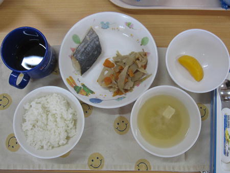 ・ぶり照り焼き ・海苔和え ・わかめごはん ・味噌汁 ・モモ缶