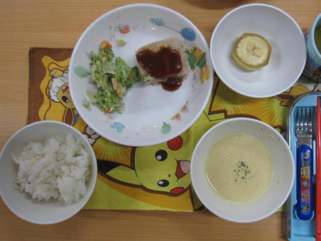 ・ハンバーグ ・コーンサラダ ・ごはん ・コンソメスープ ・パイン缶