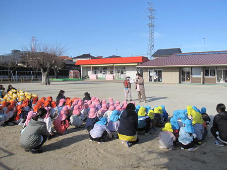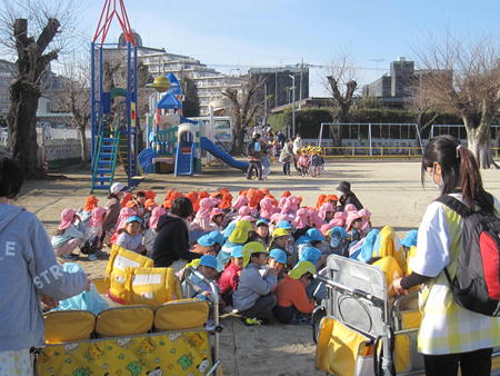 地震からの火災発生、保育部側からの火災で園庭に避難しました。