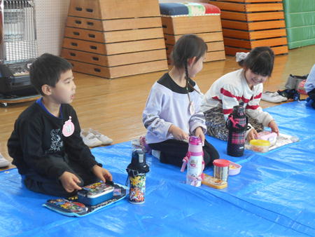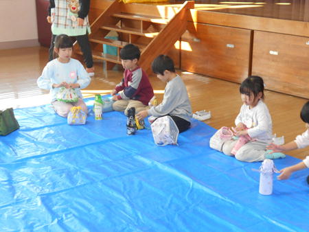 お昼になったら体育館にシートを敷き、みんなでお弁当を食べました♪