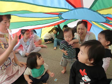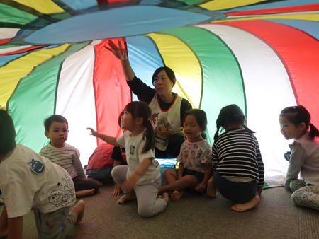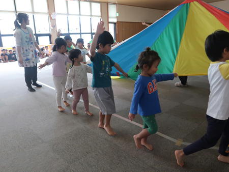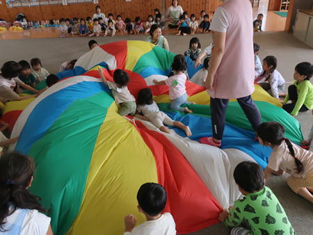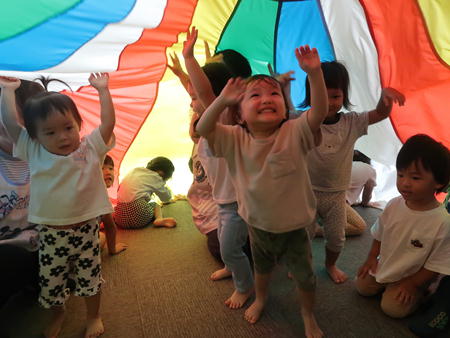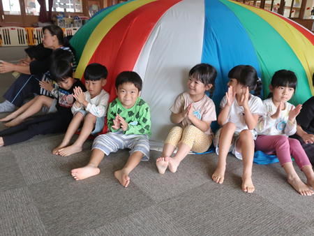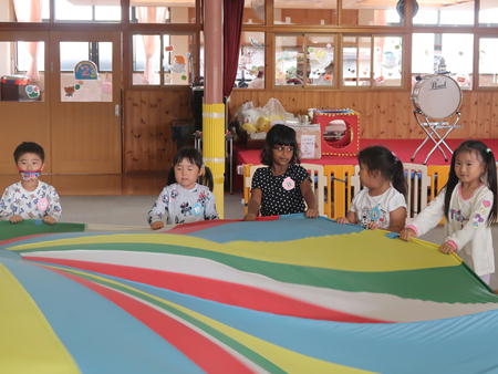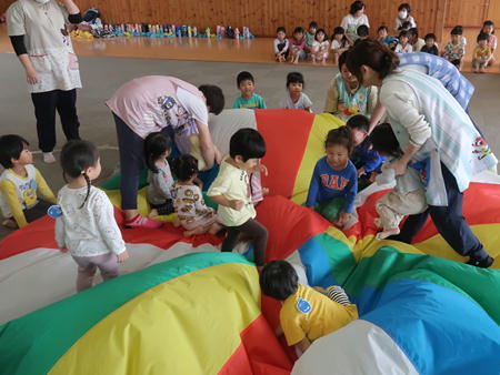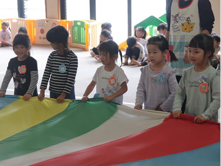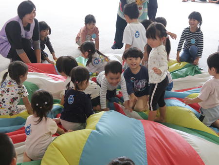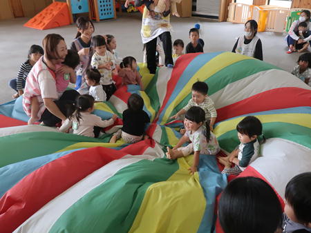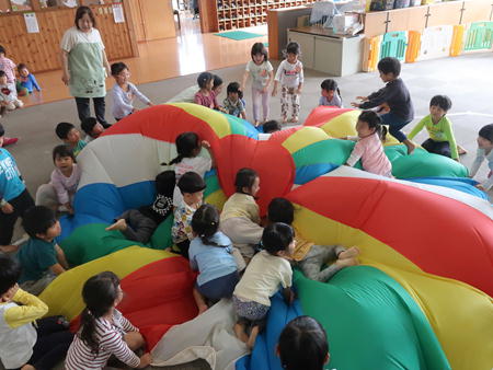 パラバルーンで遊ぼう♬ 今日は保育部のホールにみんなで集まり、運動会で年中さんが披露したパラバルーンで遊びました。 保育部のお友だちも最初は怖がっていましたが、膨らんだバルーンにのぼってみたり、風船のように膨らんだバルーンの中に入ってみたりして楽しそうでした。 年少さんは間に入って年中さんと一緒にやってみました。 年長さんも去年やりましたが、ひさしぶりにやってみて楽しそうでしたよ。