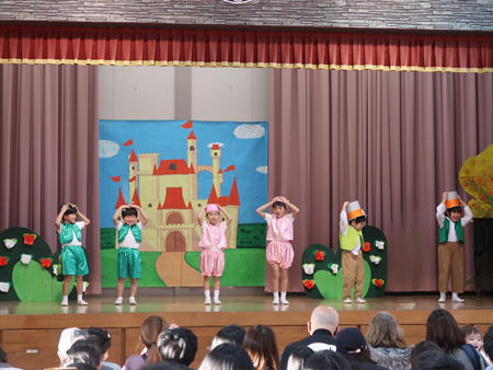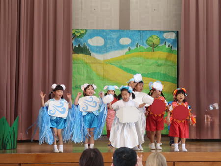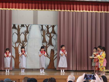 お遊戯会ごっこ 先日行われたお遊戯会を各クラス皆さんにご披露しました。 昨日は幼稚部体育館で、今日は保育部ホールでご披露♪ 年中組さん年長組さんは本番と違う役を演じる子もいました。 観客になった子どもたちは、真似て踊っている子もいましたよ。