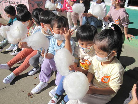 わたあめづくり 11月15日は七五三。 園では千歳あめではなく、わたあめを作って食べています♪ くるくるくるくる・・・。 あまーいいいにおいがしてました。 上手に丸く作ったあとは、みんなで一緒に「いただきまーす!」