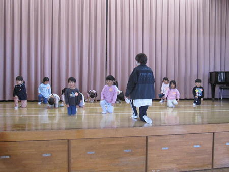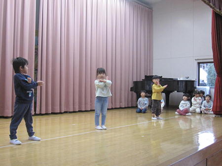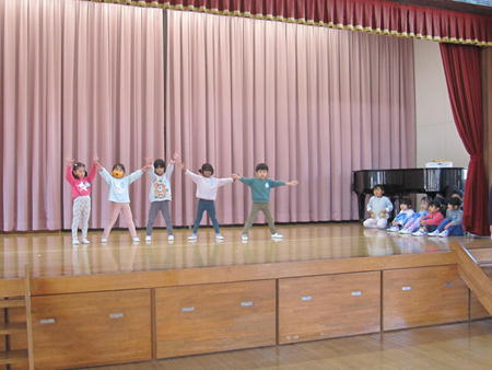 お遊戯会ごっこ 幼稚部、保育部みんな集まって、お遊戯会の踊りを各クラスがほかのクラスのお友だちに披露しました。 劇を披露したクラスでは、当日とは違う役を演じており、上手にできました。 見ているお友だちも真似をして踊って楽しんでいました。